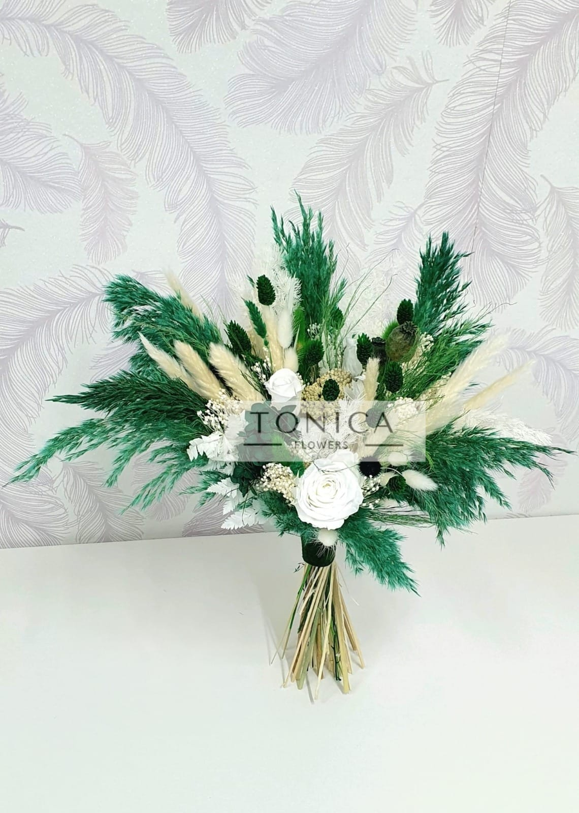 Buchet realizat din flori naturale criogenate si flori naturale uscate/stabilizate.