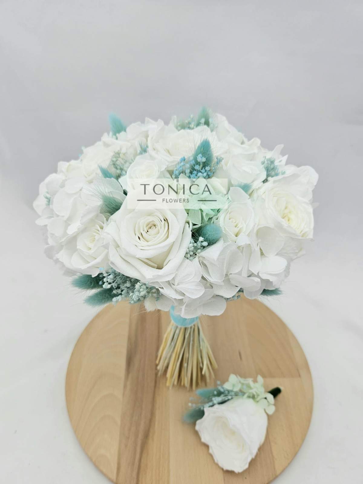 Buchet realizat din flori naturale criogenate si flori naturale uscate/stabilizate.