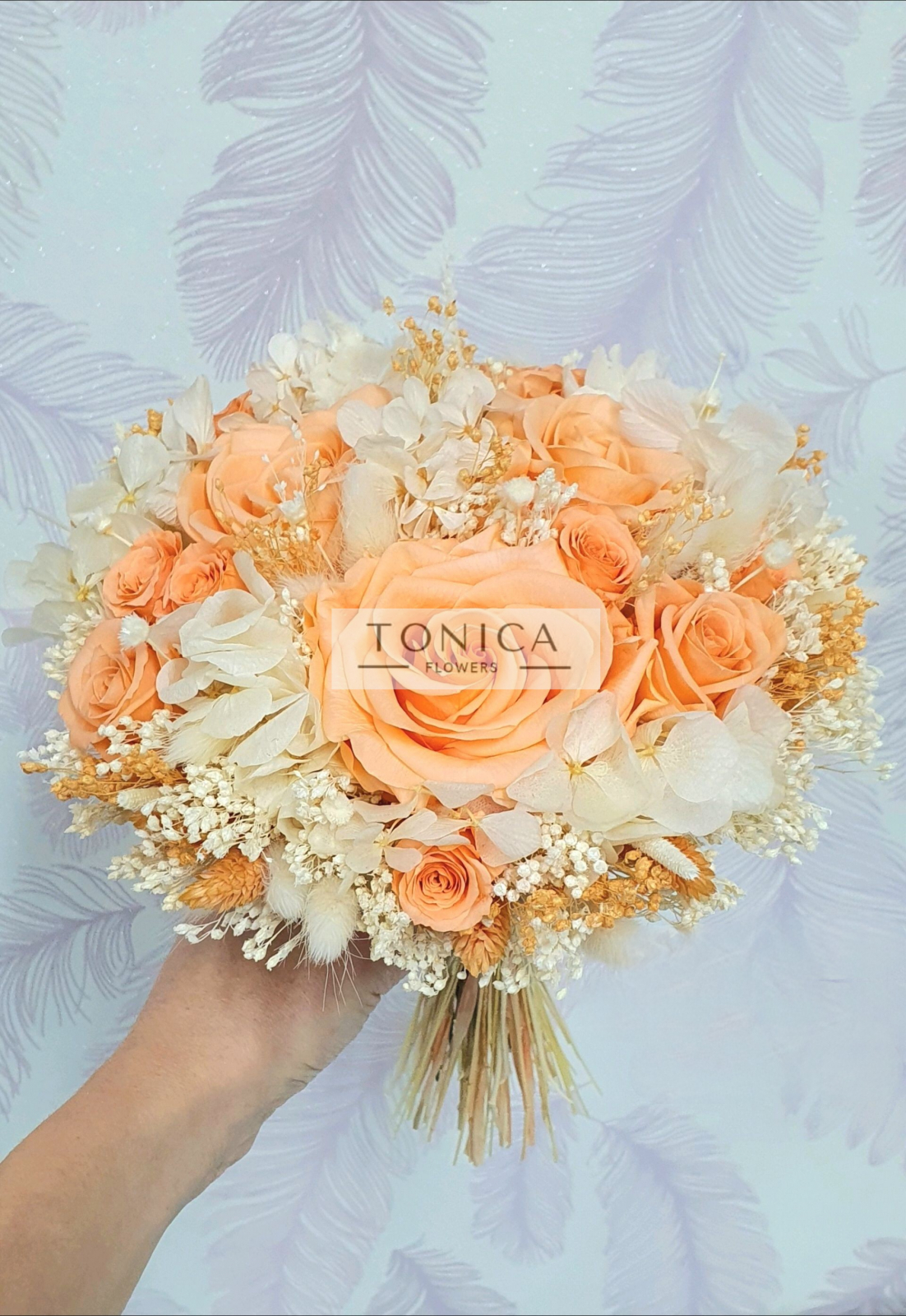 Buchet realizat din flori naturale criogenate si flori naturale uscate/stabilizate.