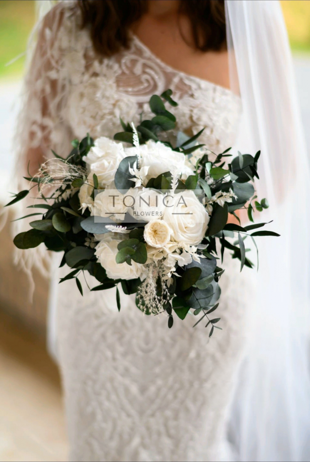 Buchet realizat din flori naturale criogenate si flori naturale uscate/stabilizate.