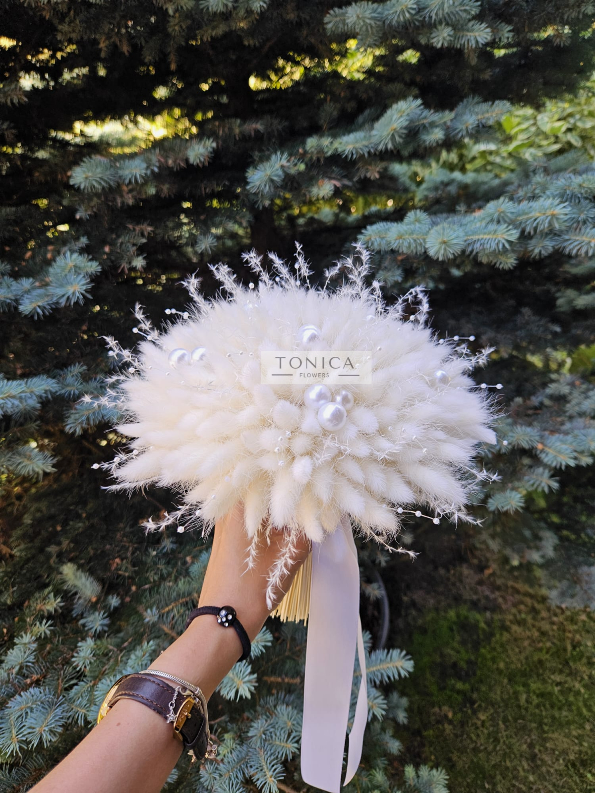 Buchet realizat din plante naturale uscate/stabilizate si perle de diferite dimensiuni.
