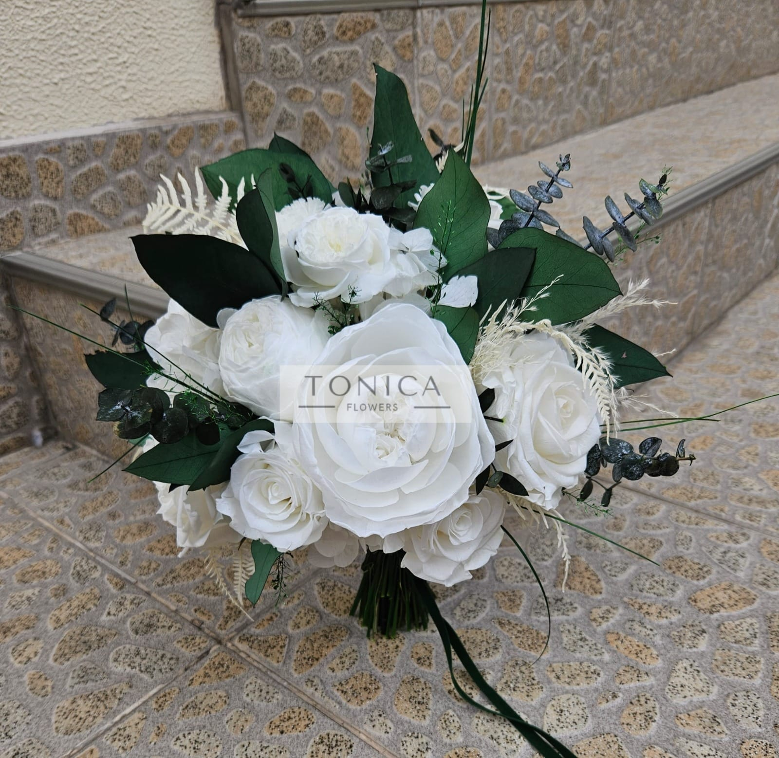 Buchet realizat din flori naturale criogenate si flori naturale uscate/stabilizate.