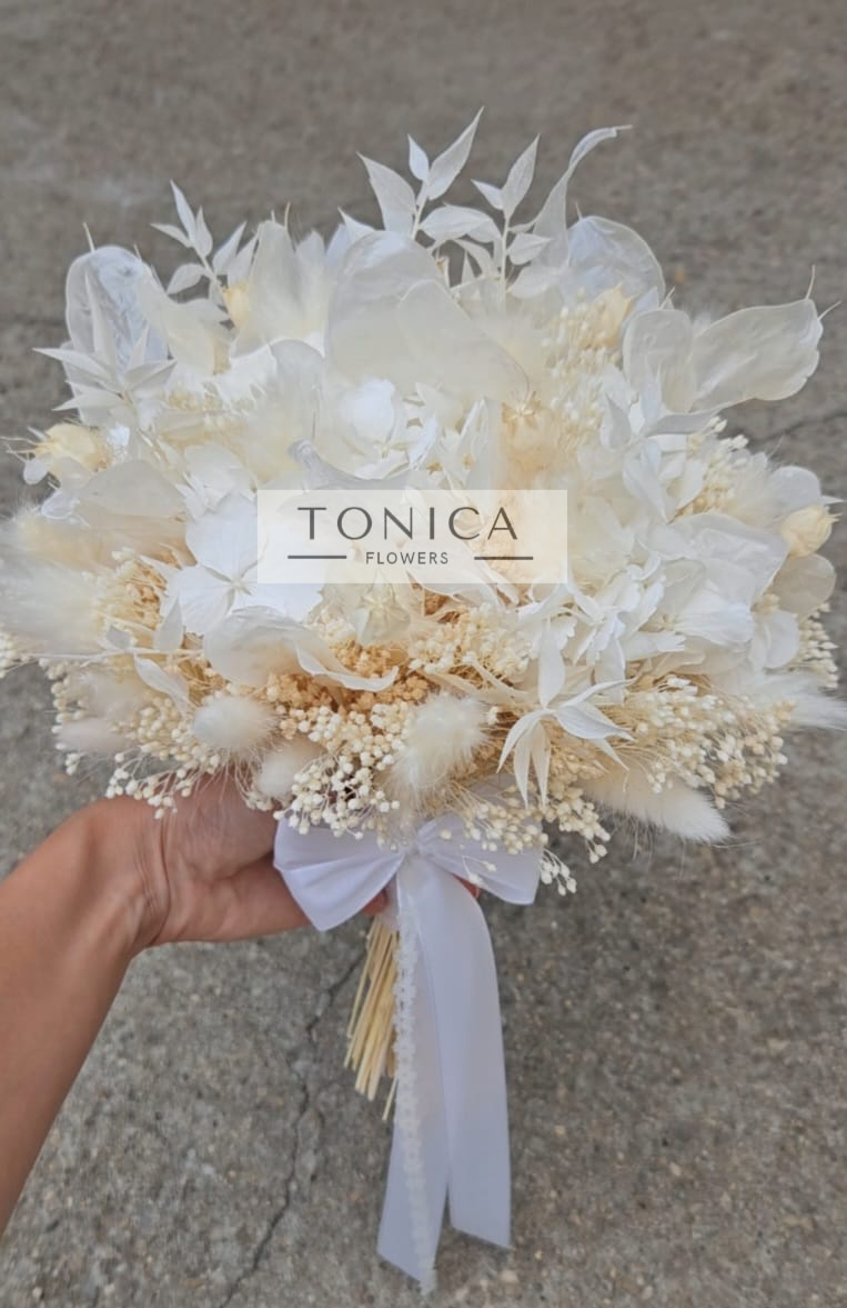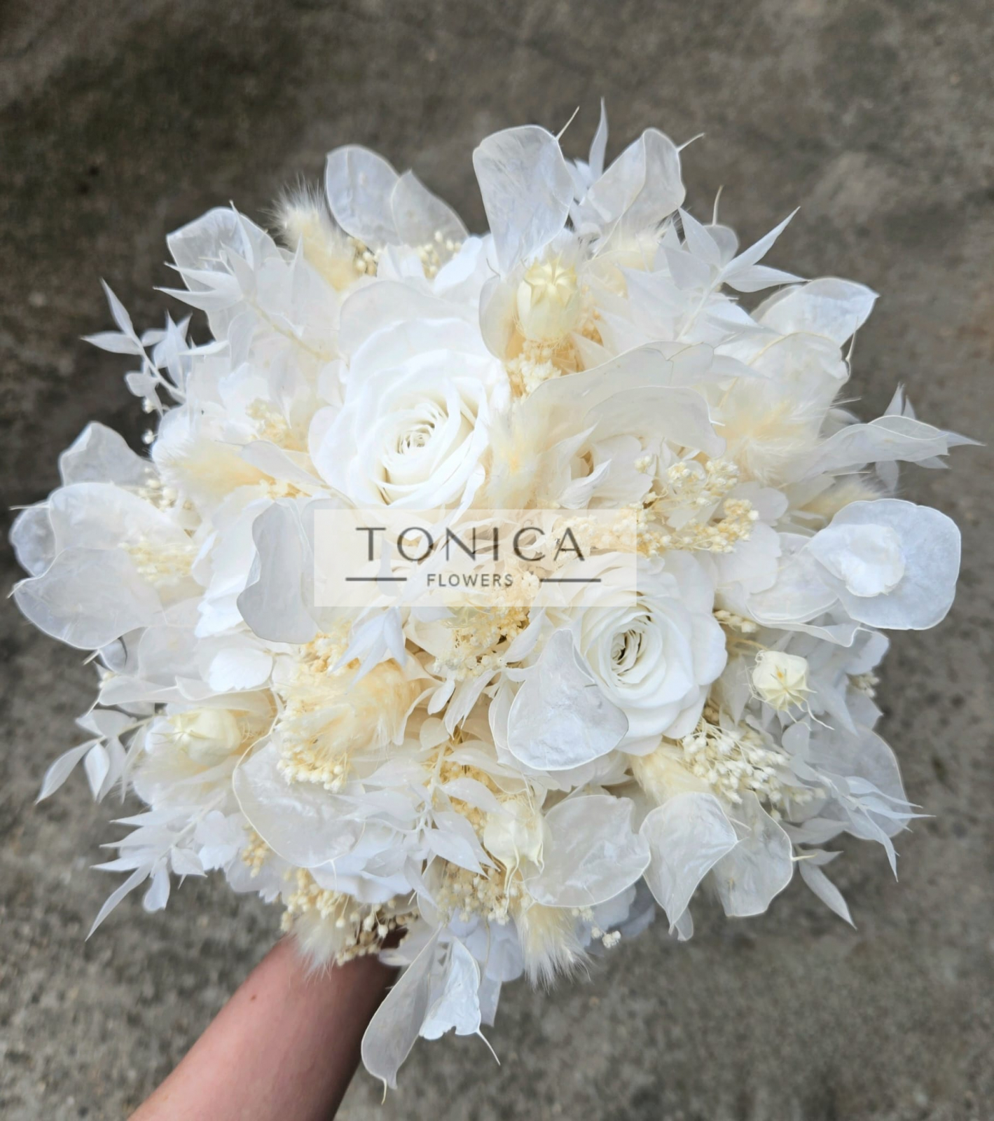 Buchet realizat din flori naturale criogenate si flori naturale uscate/stabilizate.