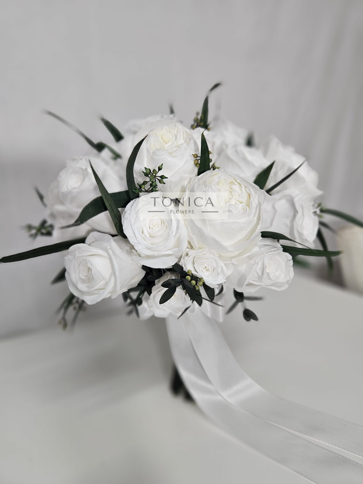Buchet realizat din flori naturale criogenate si plante naturale stabilizate.