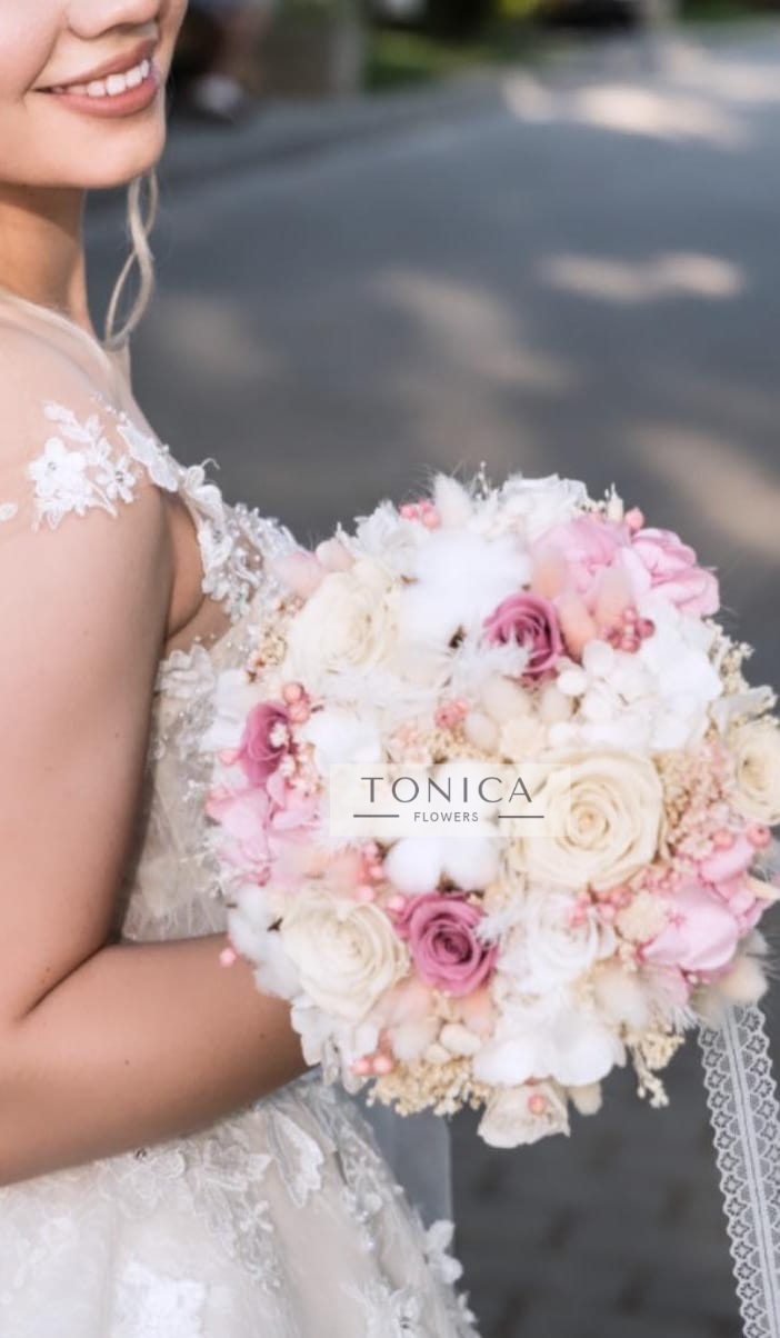 Buchet realizat din flori naturale criogenate si flori naturale uscate/stabilizate.