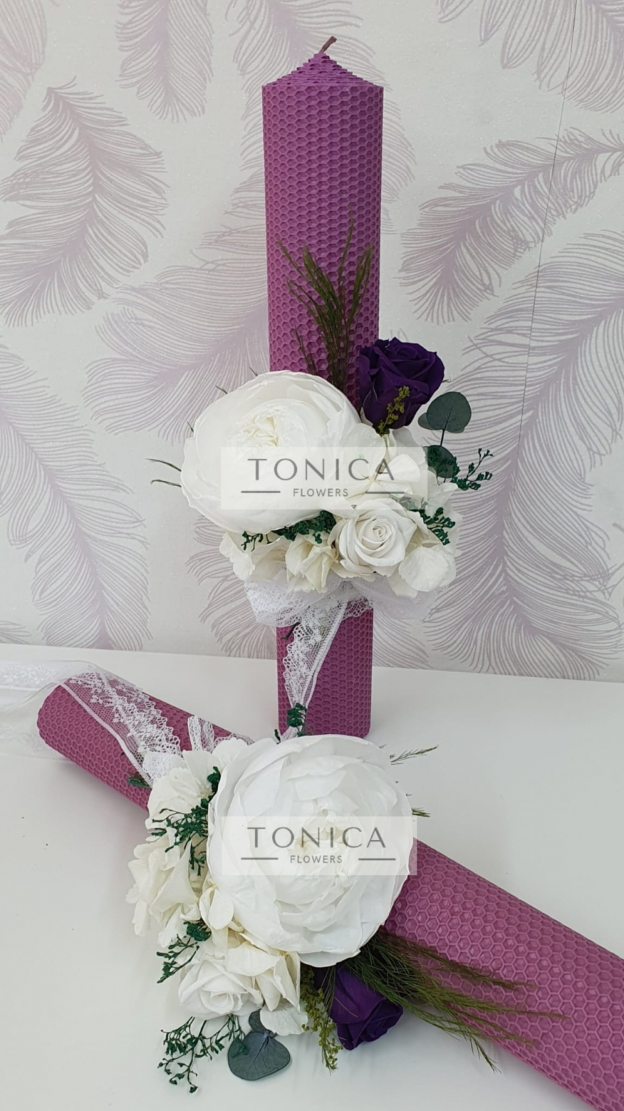 Lumanare tip fagure din ceara naturala, flori naturale criogenate (bujor+trandafiri) si flori naturale uscate/stabilizate.