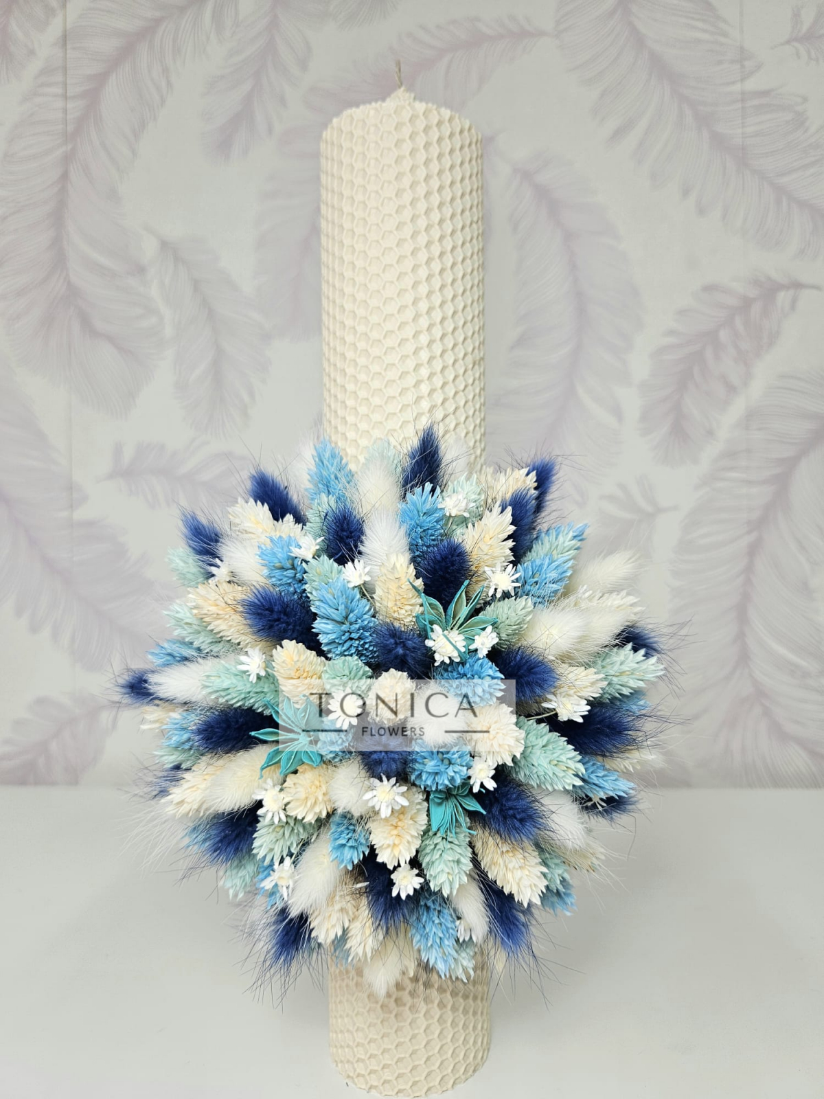 Lumanare botez tip fagure din ceara naturala, flori naturale criogenate (bujor) si flori naturale uscate/stabilizate.
