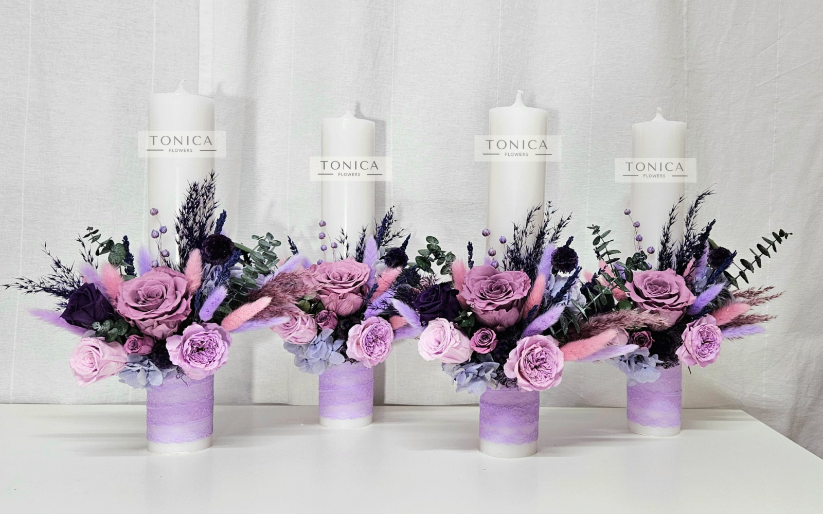 Lumanare din parafina, flori naturale criogenate si flori naturale uscate/stabilizate.
