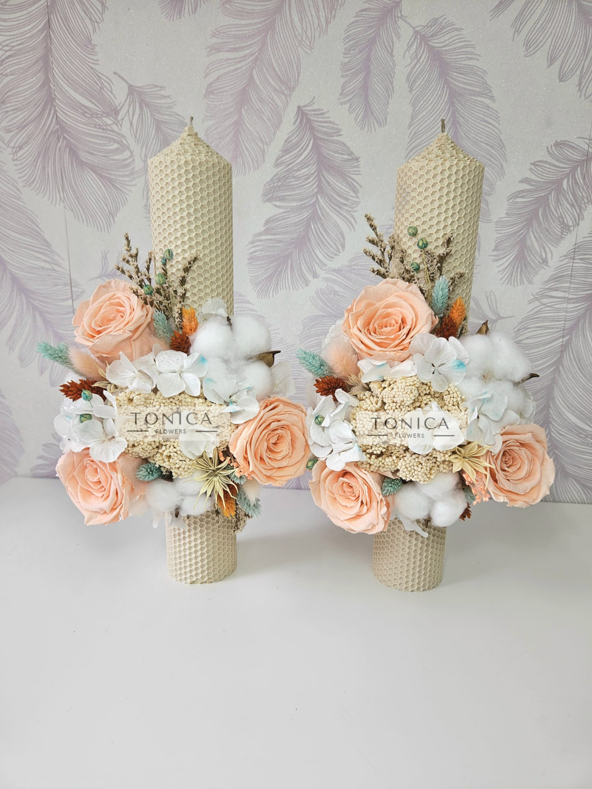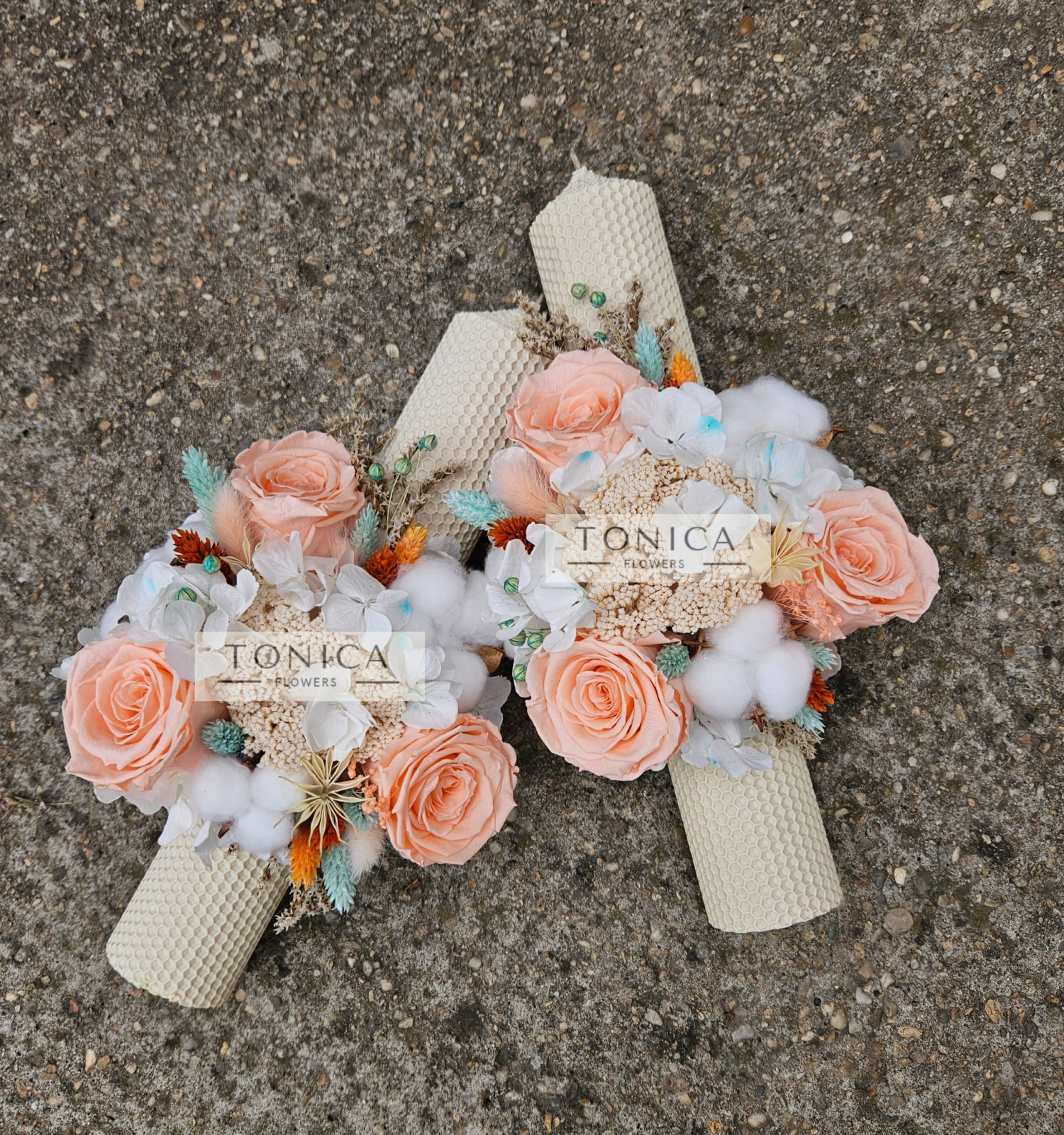 Lumanare din parafina, flori naturale criogenate si flori naturale uscate/stabilizate.