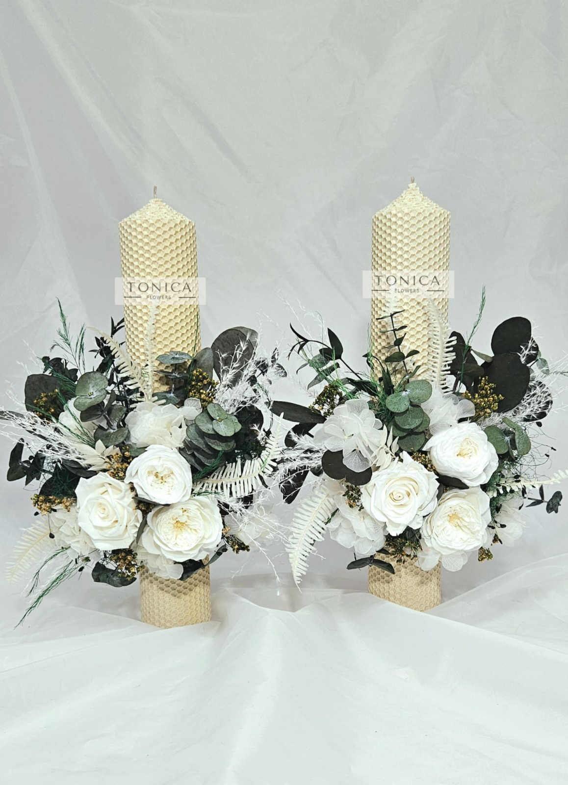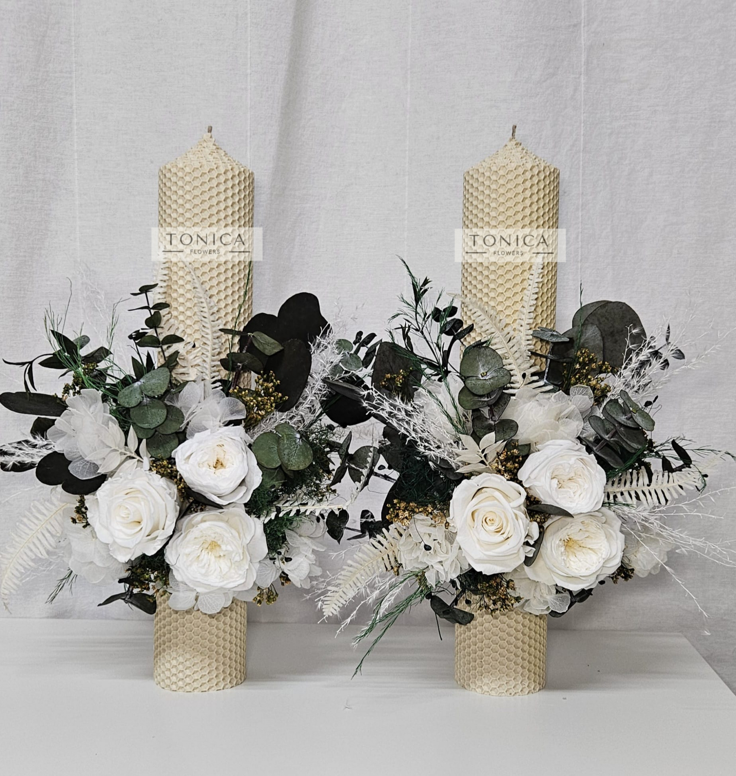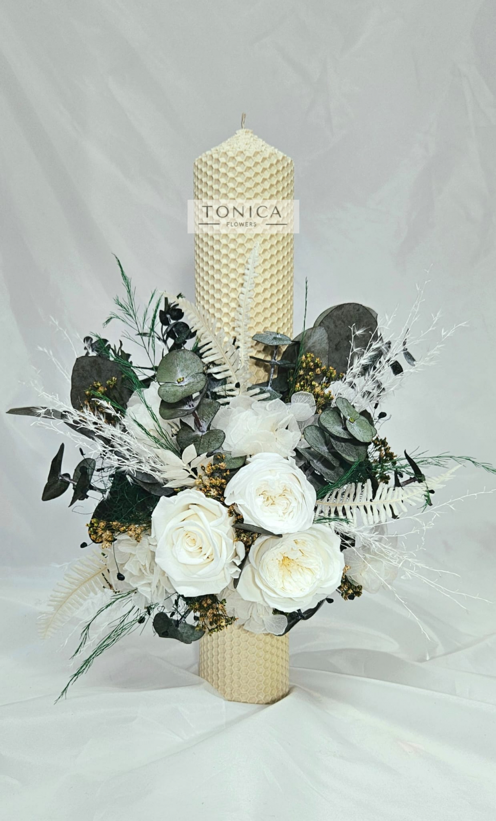 Lumanare tip fagure din ceara naturala, flori naturale criogenate si flori naturale uscate/stabilizate.